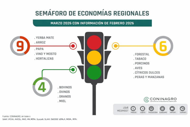 El último informe del “Semáforo de Economías Regionales” elaborado por Coninagro encendió nuevas señales de alerta en el sector productivo: aumentó la cantidad de actividades en rojo y persiste el estancamiento de precios frente a costos en alza.