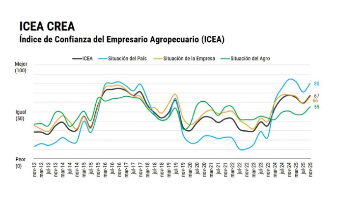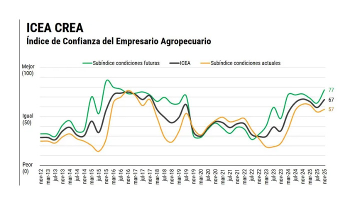 Cambios significativos para el ICEA: la encuesta realizada por CREA en el pasado mes de noviembre evidencia una recuperación marcada del índice de Confianza del Empresario Agropecuario (ICEA), lo que se explica principalmente por mejores expectativas sobre la evolución de la economía argentina.