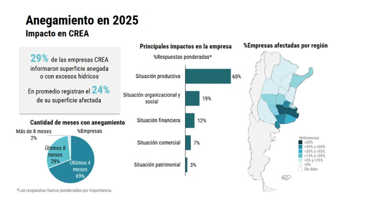Los excesos hídricos registrados en los últimos meses representan una situación crítica que afecta a muchas regiones y empresas agropecuarias: un 29% de los encuestados presentan anegamientos que comprometieron en promedio un 24% de la superficie productiva. Los mayores inconvenientes se registran en la provincia de Buenos Aires.