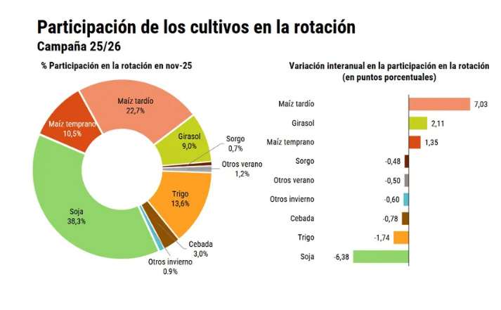 En lo que respecta a la planificación de la campaña agrícola 2025/26, entre los consultados se prevé un crecimiento sustancial del área de maíz tardío con respecto a 2024/25, además de crecimientos más moderados de girasol y maíz temprano. La mayor reducción de superficie agrícola de la campaña en curso corresponderá a la soja, principalmente por las condiciones de precios relativos menos favorables para la oleaginosa.