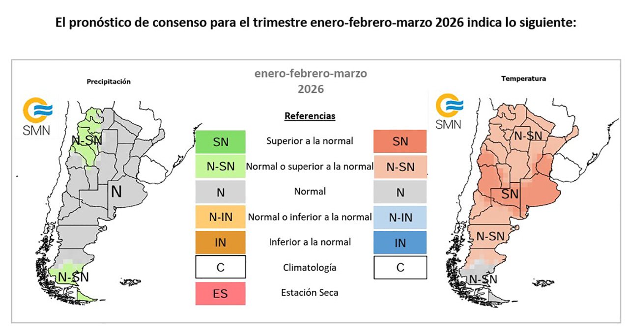 En el aspecto hídrico, “para este trimestre se esperan precipitaciones dentro del rango normal para la época en gran parte del país, según el Servicio Meteorológico Nacional”, señaló Gattinoni, quien además destacó que el noroeste y el sur del territorio nacional presentan mayores probabilidades de un trimestre entre normal y más húmedo.