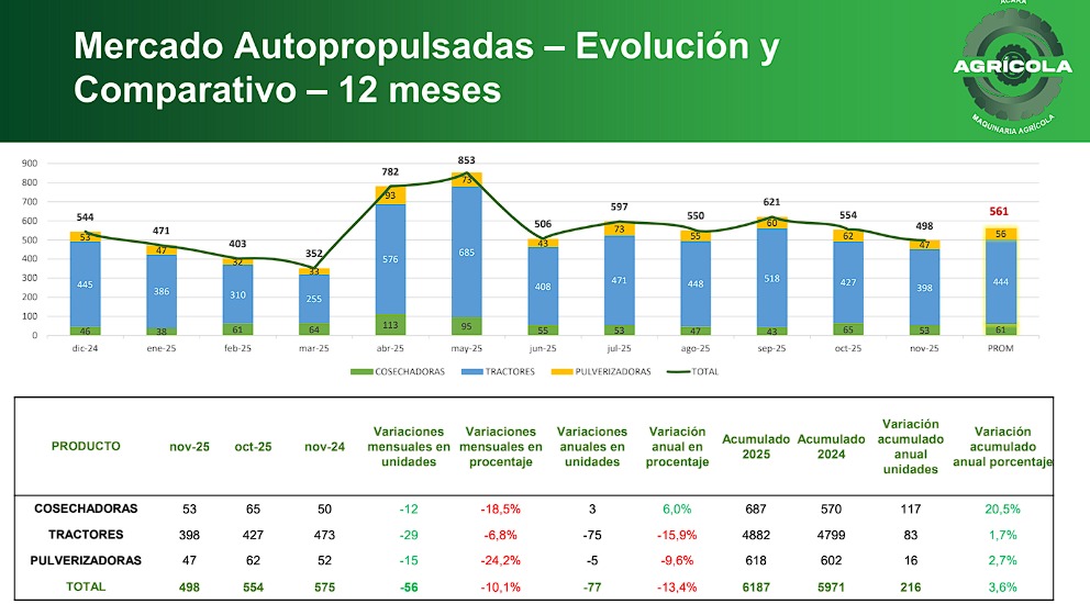 La División de Maquinaria Agrícola la Asociación de Concesionarios de Automotores de la República Argentina (ACARA) informa que los patentamientos de cosechadoras, tractores y pulverizadoras de noviembre de 2025 alcanzaron las 498 unidades, una baja del 13,4% interanual ya que en noviembre de 2024 se habían registrado 575.