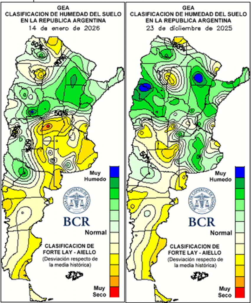 El 2026 comenzó con un alivio de las temperaturas y algunas lluvias aisladas, aunque insuficientes para revertir la situación. Todo esto que pasó en pocos días, tuvo un gran impacto en las expectativas de rindes superadores para los maíces tempranos. La posibilidad de concretar rindes de 120 a 130 qq/ha en la región central, incluyendo el centro de Buenos Aires, quedó atrás. En esta 1ra estimación se toman en cuenta expectativas más moderadas, en torno a rindes promedios para la región central, en donde las siembras tempranas fueron muy importantes. Los técnicos de estas zonas coinciden en señalar que «hay una sensación de que el maíz temprano se pinchó, perdió el potencial en el llenado». La falta de agua y el estrés por altas temperaturas estaría dejando entre un 10 y 20% de recorte en función de cuándo y cómo regrese el agua.