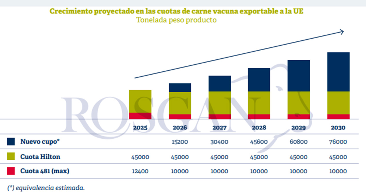 No obstante, el volumen total al que accedería el Mercosur en su conjunto estaría compuesto por el contingente asignado bajo la Cuota Hilton, equivalente a aproximadamente 45.000 toneladas anuales; otras 10.000 toneladas máximo correspondientes a la Cuota 481, actualmente vigente para terceros países; y este nuevo cupo adicional, que se incorporaría de manera progresiva año a año hasta alcanzar unas 76.000 toneladas peso producto a partir del quinto período.