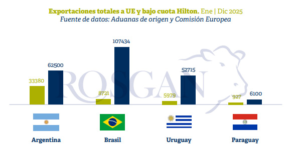En el caso de Argentina, que goza de una posición claramente dominante dentro de la Cuota Hilton con 29.500 toneladas asignadas por ciclo comercial, el volumen exportado por fuera del contingente duplicó en 2025 al ingresado bajo cuota. Para el resto de los orígenes —especialmente Brasil— los excedentes resultan aún más significativos.